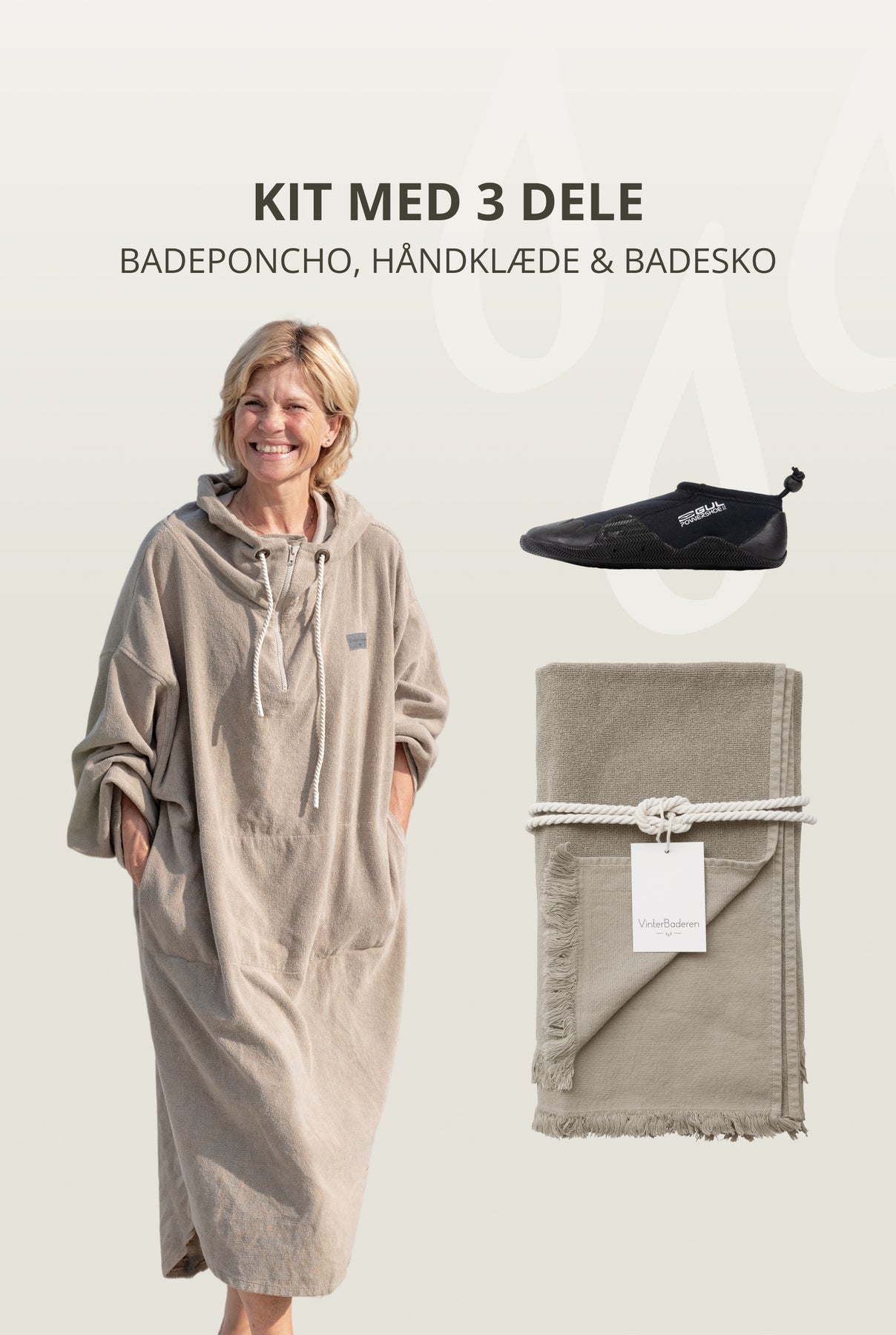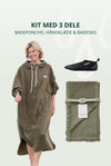 Med dette badesettet får du alt du trenger for livet ved vannet – hele året. En romslig poncho med skjult lomme og hurtigtørkende vevd stoff, et lett og absorberende badehåndkle og myke, fleksible badesko som beskytter føttene dine mot både kulde og steiner. Et sett for deg som vil starte godt – eller alltid være klar for neste dukkert.